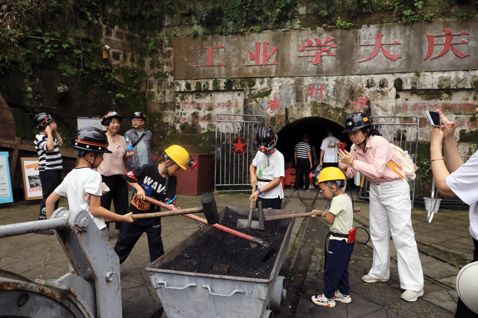 主打真实体验的黄村井矿井,在增添节日气氛的同时,从工矿文化中汲取趣味看点,编排互动情景剧并增设互动NPC演员,让入园游客一秒穿越上世纪。诸如拉汽笛的小火车司机、磨豆花的矿工夫妇等生动形象,吸引游客纷纷合影留念。